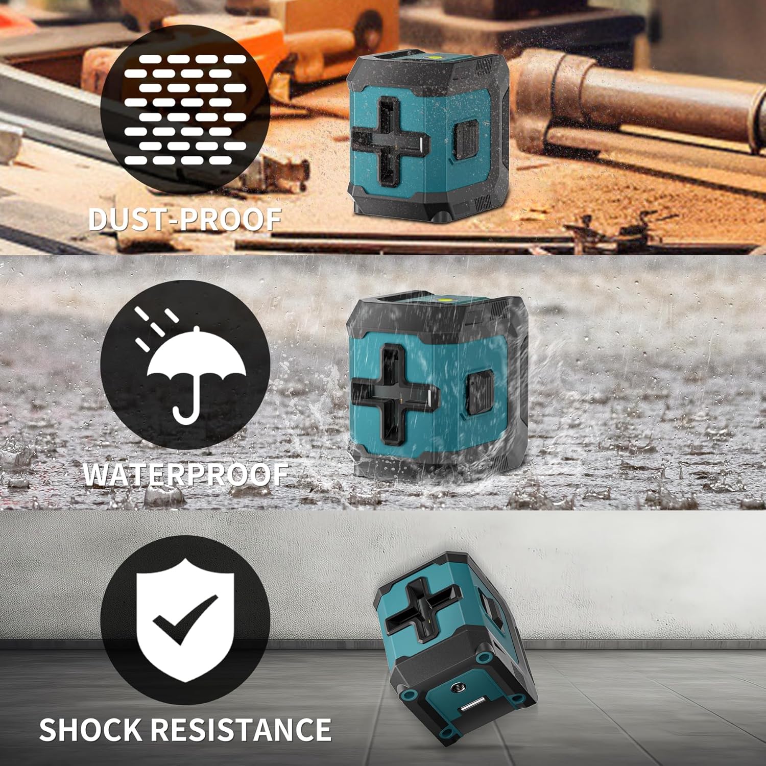 - Built to Withstand Tough Conditions Engineered with a rugged design, this laser level boasts an impressive IP54 protection grade. It’s shock-resistant, waterproof, dustproof, and built to withstand the harshest environments. The durable shockproof enclosure provides reliable protection, even from falls of up to 4 feet. The compact and light weight design of this laser level for construction makes it easy to handle, yet stable enough to sit securely on surfaces.