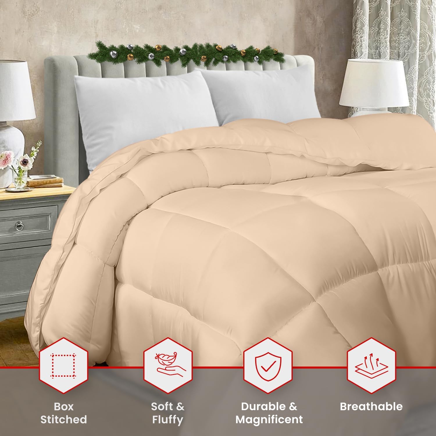 - Box Style Stitching: Crisp looking comforter with siliconized fiber filling features piped edges with an elegant style box stitching that prevent the fill from shifting