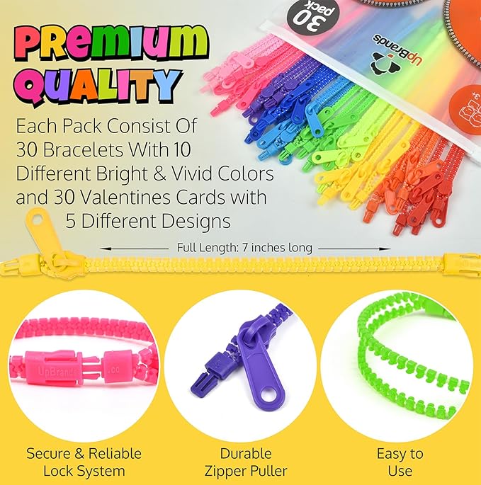 UpBrands 30 Valentine’s Day Cards for Kids School & Fidget Zipper Bracelets Party Favors Toys